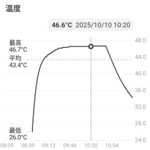 20分くらいでほぼほぼ45度近くまで上昇。(ドライヤー本体ではもう50度になっていました)