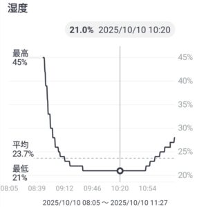 湿度もまぁ温度と反対方向で20分くらいで25%に、その後は21%くらいで安定する傾向でした。